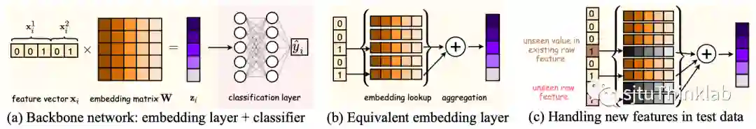 首先,神经网络分类器 可以分解为两个级联的子模块,分别是特征embedding层和classifier层(如下图(a)所示)。这里的embedding层可以视为一个特征embedding字典,每一行是一个特征的embedding,它对输入向量 中每一个非0的特征查找出相应的embedding,而后对所有返回的特征embedding做一个sum pooling聚合,得到中间层的hidden vector,用于接下来classifier层的前馈计算。这里的sum pooling操作对于特征维度是置换不变(permutation-invariant)的。所谓置换不变性,就是指当交换输入 各元素的位置, 输出保持不变。