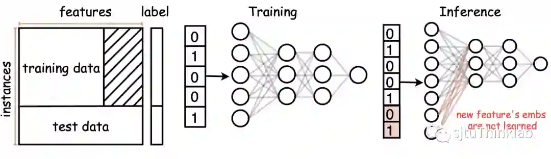目前的大多数机器学习任务,通常假设训练数据与测试数据共享一个特征空间。然而在实际场景中,训练好的模型通常需要与一个开放环境进行交互,测试集中就会出现新的特征。例如推荐系统中利用用户的年龄、职业等特征训练好了一个推荐模型,后来公司新发布了某个应用,收集到了新的用户数据,这就需要用新的用户特征进行决策。