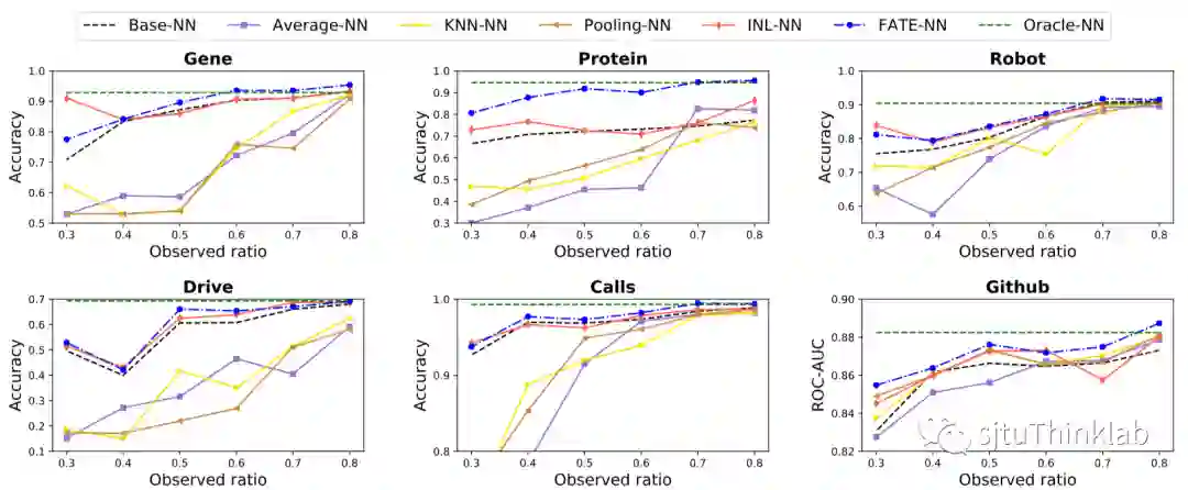 在多/二分类数据集上,我们考虑如下评测准则:随机将数据样本划分为6:2:2的train/val/test集,再随机从所有特征中选出部分观测特征;模型在只有观测特征的训练数据上训练,在具有所有特征的测试数据上计算accuracy(多分类)或ROC-AUC(二分类)。对比以下方法:1)Base-NN只用观测特征训练和测试;2)Oracle-NN:使用全部特征训练和测试;3)Average-NN/KNN-NN/Pooling-NN:使用average pooling聚合所有特征embedding/KNN聚合相近特征embedding/不含参数的mean pooling GCN聚合相邻特征embedding来推断新特征的embedding;4)INL-NN先在仅有观测特征的训练数据上训练到饱和再在新特征上局部更新。在6个小数据集上,考虑不同的观测特征比例(从30%到80%),对比结果如下(图中FATE为本文提出的方法)。