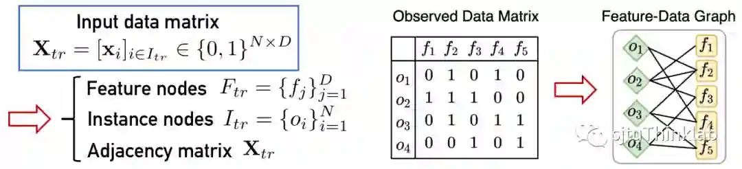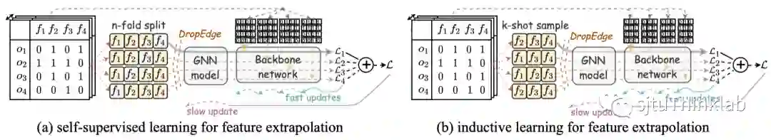 事实上,当我们利用输入数据将样本与特征表示在一张图上后,通过图结构我们就能得到样本-特征以及特征-特征之间的关系。这里特征-特征的关系由样本作为中间节点,也就是图上的二阶相邻信息给出。基于此,图的建立为我们提供了天然的已观测特征与未观测特征的联系。当模型完成训练后,我们可以得到已观测特征的表示embedding,而后对于在测试阶段引入的新特征,我们就可以利用图结构做信息传递,把已观测特征的embedding信息通过图神经网络计算新特征的embedding,从而实现特征的外推。