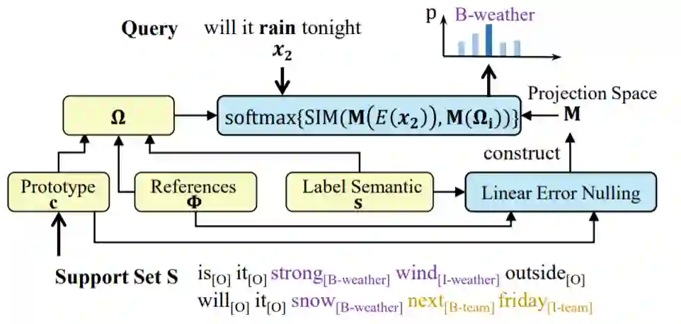 为了在小样本情形下得到每个词的标签概率(Emission Score),我们提出L-TapNet,来基于每个词和不同标签表示的相似度计算属于不同标签的概率。L-TapNet在计算时利用了label名字中的语义信息,并通过线性偏差消除法(Linear-error Nulling)构造映射空间来将不同标签类别在embedding空间有效分开。