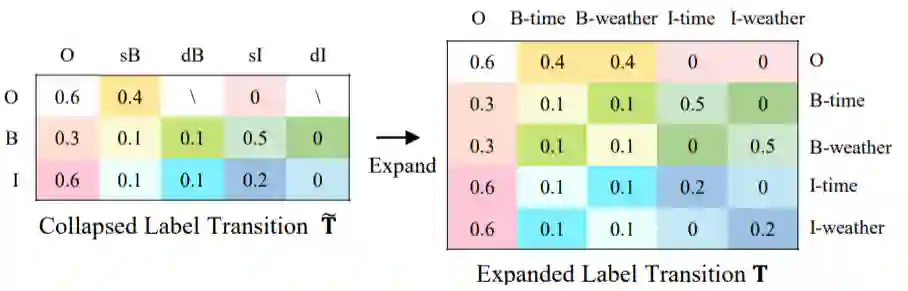 在本文中,为了建模标签之间的依赖关系(Transition Score),我们提出了一种跨领域建模标签依赖关系的方法——坍缩依赖迁移(Collapsed Dependency Transfer)。我们首先从数据充足的源域(Source Domain)学习抽象标签依赖关系,并在少样本的目标域中泛化学到的依赖关系来辅助标签序列的预测。