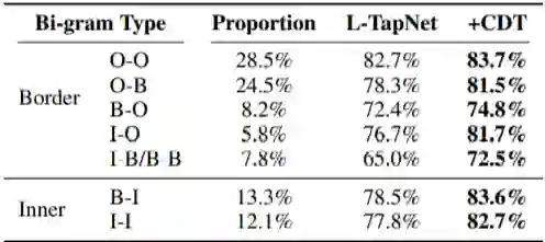 此外,在表七中,我们和标签转移规则进行了比较,发现CDT可以大幅优于传统的基于规则的转移,由此可知迁移标签依赖学到了规则意外的更丰富的知识。