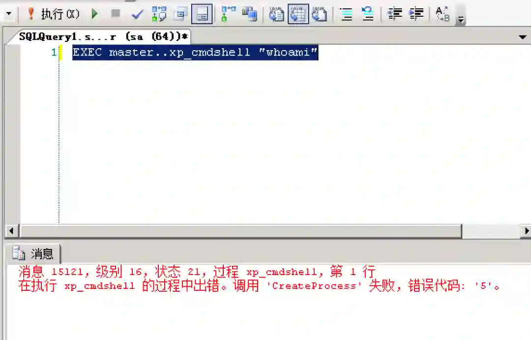 由于反病毒软件会监控xp_cmdshell,一执行就会返回CreateProcess Error Code 5等问题,sp_oacreate是能够解决,但是没有回显,可通过发送网络请求来看。