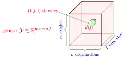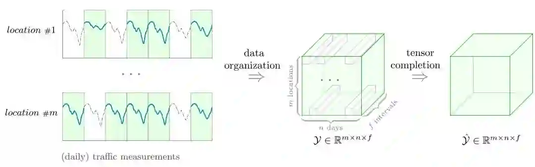 张量补全任务及其框架,包括数据组织和张量补全,其中部分地观察了流量测量。