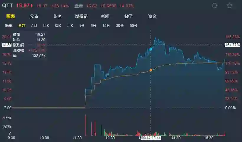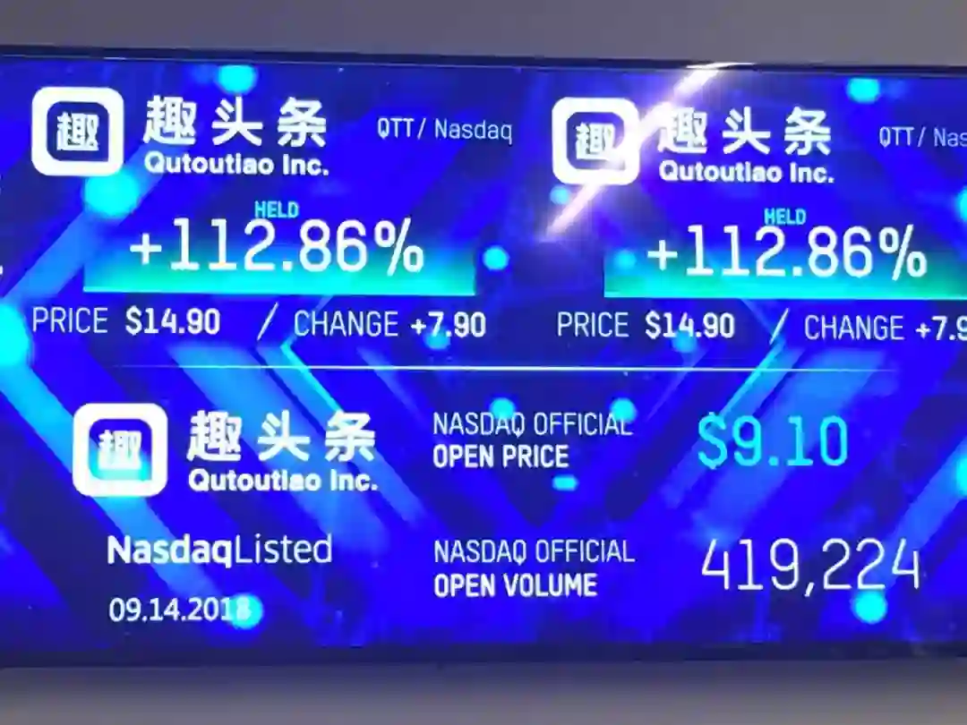 9月15日,趣头条在美国纳斯达克交易所挂牌上市后,受到投资人追捧。开盘价报9.1美元,盘中经历5次熔断,涨幅一度超过190%,收盘涨128.14%,报价15.97美元,收盘市值45.88亿美元,创下今年美股IPO股票(IPO规模超过500万美元)中的最高首日涨幅。