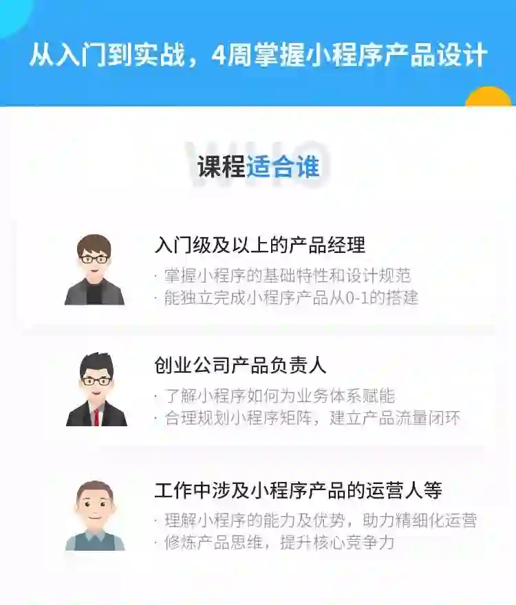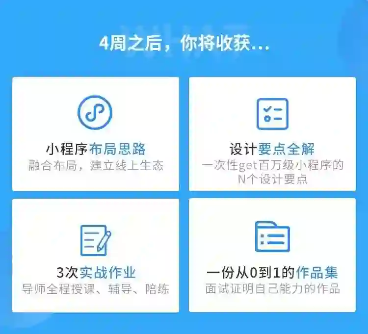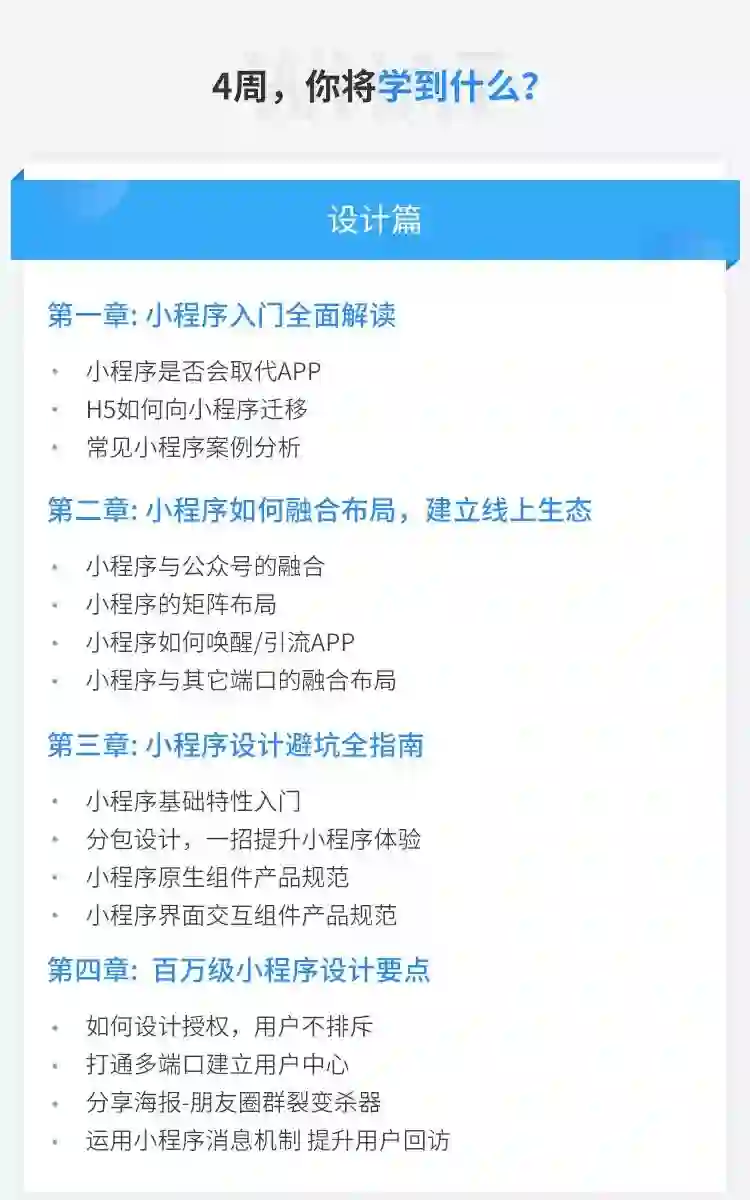 并通过全程项目实战,手把手教你独立完成商业级小程序的全流程产品设计,同时强化自己多端口产品的设计能力,提升职业竞争力。