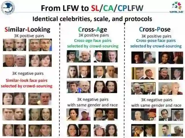 于是,我们尝试在同一名人集合的情况下把LFW的难度加大。从缩小类间差异的角度,利用众包方式从LFW原有图片集合里挑选了一些外貌相似的人脸(比如周润发和他的替身)。从增大类间差异的角度,利用众包方式根据LFW各个folder的名人列表挑选了年龄跨度较大或者姿态跨度较大的图片组(例如乔布斯不同年龄的图片和马爸爸的各种姿态图片)。