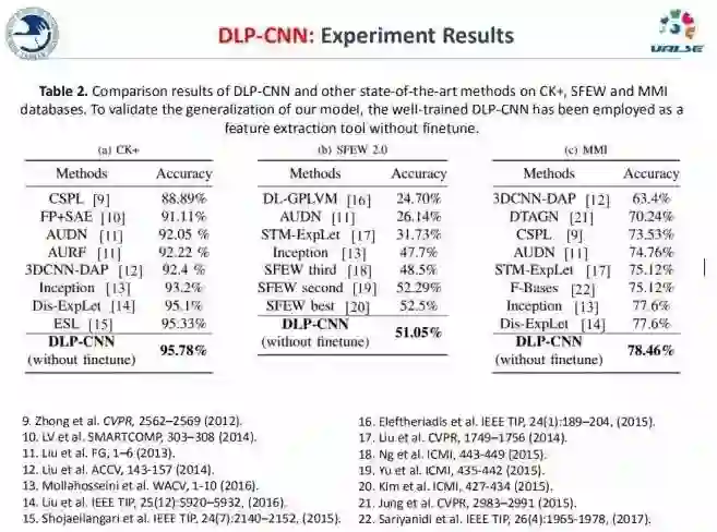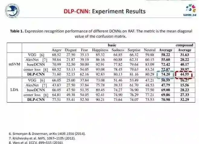 实验数据表明,DLP-CNN是能够有效提高在RAF-DB上的表情识别率的。当然该网络结构在这种具有挑战性的真实世界人脸表情数据上的表现能力也是有限的,我们也期望大家能提出更加有效的算法来提高在RAF-DB上的表情识别率。
