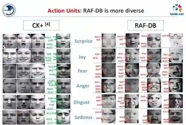 在实验室数据库CK+以及真实世界数据库RAF-DB上的面部动作单元(Action Unit)标注结果表明,人们日常生活中所自然流露出来的面部表情与在实验室环境下统一规定出的面部表情是有很大区别的。