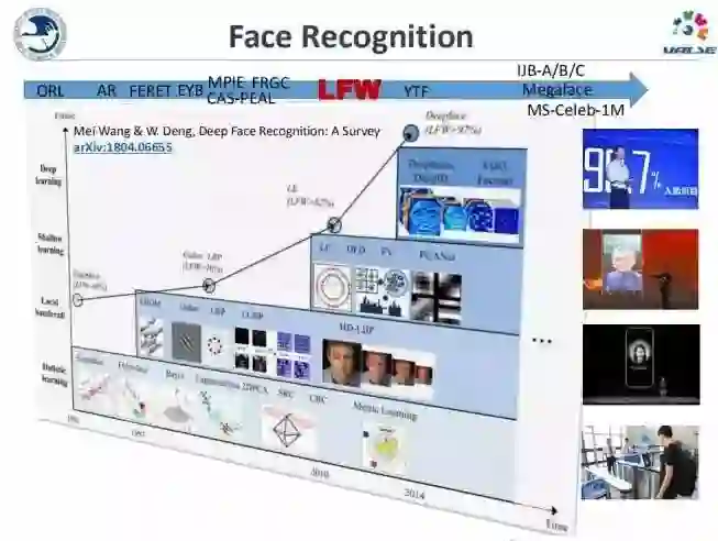 接下来的局部特征学习的方法进一步提高特征的区分性和紧致性。最受瞩目的当然是2014年开始的深度人脸识别浪潮,因为它在很短的时间内就把LFW实验的准确率从80-90%提高到接近100%。