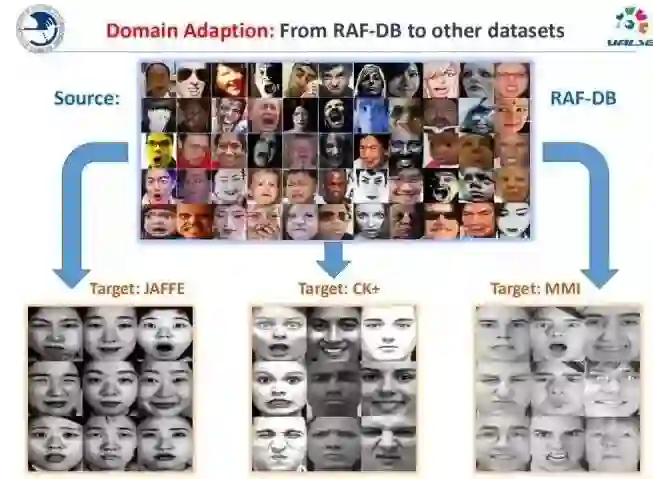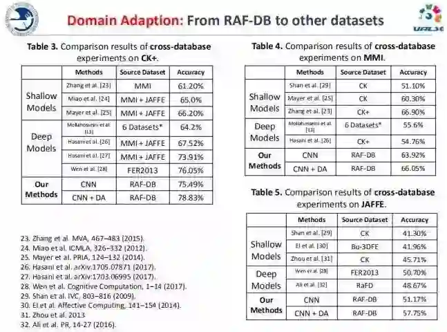 于是我们将RAF-DB作为源域,在CK+,JAFFE,MMI等目标域上进行了domain adaption算法的评估。实验结果显示,该区域自适应方法能够有效地提高跨库人脸表情识别率。