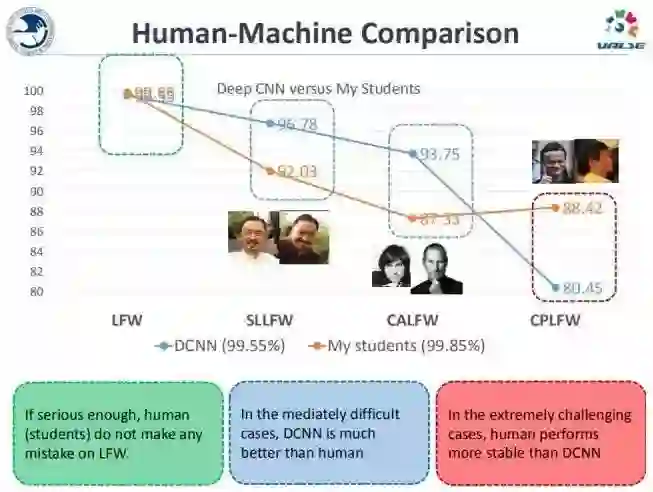 更有趣的结果是,我们可以对比人在三种高难度的情况下,识别率是多少?参与测试的人主要是我的研究生,所以他们做的比较认真,比一般众包的人工标注更认真。在原始的LFW数据库上他们做的基本没有做错,99.85%。
