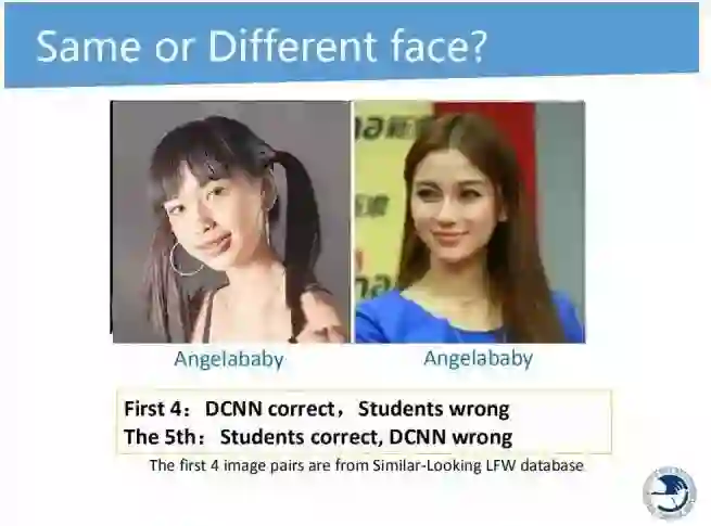 如果大家不相信机器可以大幅度地碾压人类。我们可以做个试验,大家觉得这两张图是同一个人吗?觉得不是同一个人的请举手,她其实真的不是同一个人(认为是不同人的人数不足一半)。