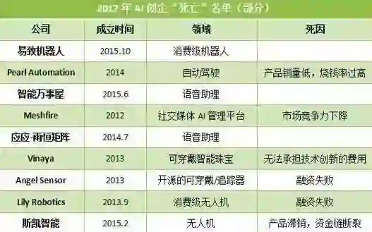 2017年AI创业企业死亡名单(部分)