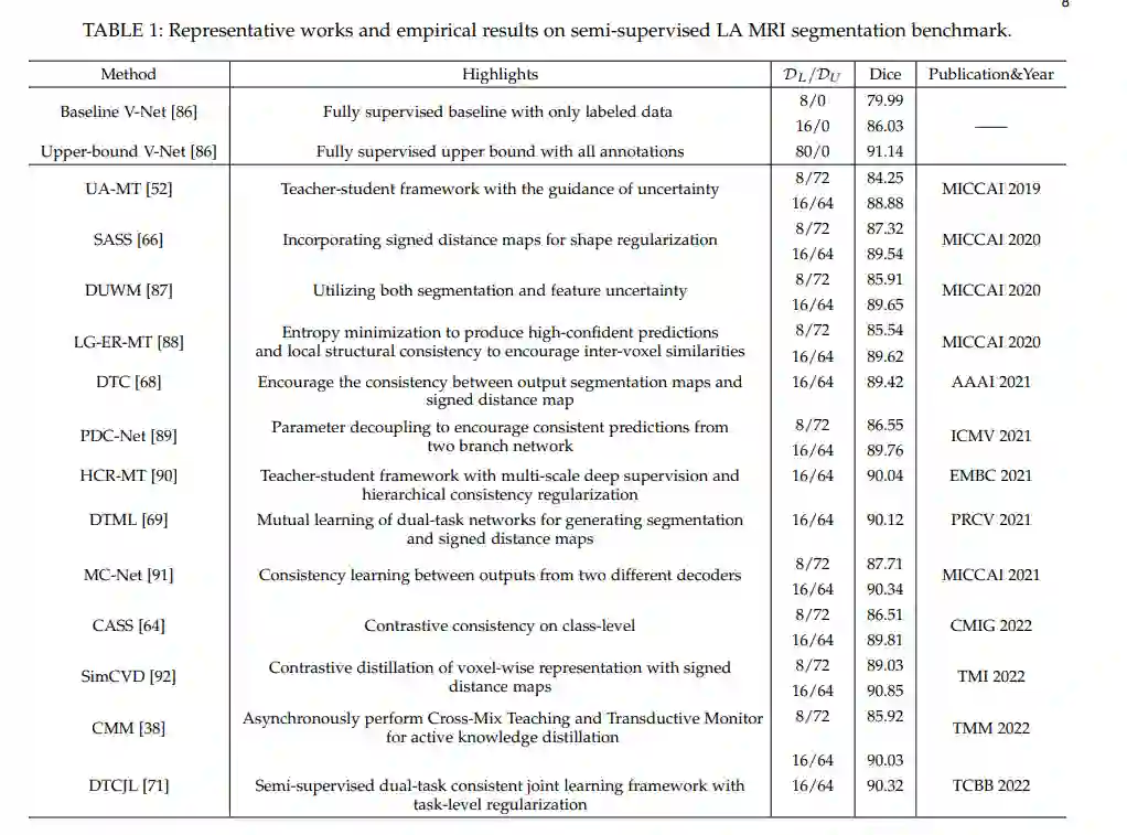 在本文中,我们全面回顾了半监督医学图像分割的最新解决方案,并总结了技术创新和实证结果。此外,我们还分析和讨论了现有方法的局限性和未解决的几个问题。我们希望这篇综述能够启发学术界探索解决这一挑战的方法,并进一步推动医学图像分割领域的发展。