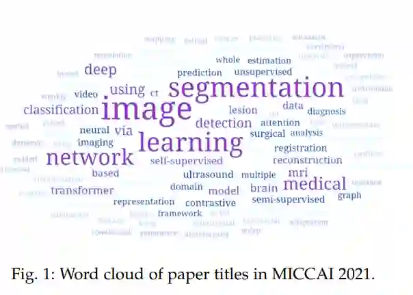医学图像分割(MEDICAL image segmentation)的目的是通过将每个像素标记为某一类,从原始图像中勾画出器官、肿瘤等感兴趣的解剖结构,这是计算机辅助诊断、治疗规划、放射治疗[1]、[2]等许多临床方法的基础和重要步骤。准确的分割可以提供可靠的体积和形状信息,帮助进一步的临床应用如疾病诊断和定量分析[3],[4],[5]。根据图1中第24届国际会议和医学图像计算与计算机辅助干预1 (MICCAI 2021)的论文标题词云,我们可以观察到“分割”是医学图像分析社区中最活跃、频率最高的研究课题之一。