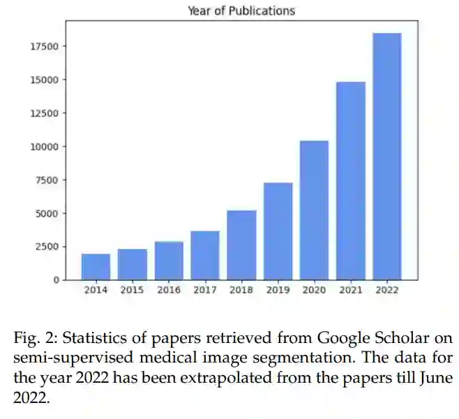 为了减轻人工标注的负担,应对这些挑战,研究人员在医学图像分割任务中投入了大量精力,通过标签生成[19]、数据增强[20]、利用外部相关标记数据集[21]和半监督学习利用非标记数据来扩大训练数据。在这些方法中,半监督分割是一种更实用的方法,它鼓励分割模型利用更容易获得的未标记数据,结合有限的标记数据进行训练,这对现实世界的临床应用有很大的影响。根据图2的统计数据,半监督医学图像分割近年来越来越受到医学影像和计算机视觉界的关注。然而,由于没有经过专家审查的注释,如何从这些未标记的数据中有效地利用有用的信息仍然是一个开放和具有挑战性的问题。