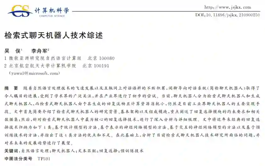 摘要: 随着自然语言处理技术的飞速发展以及互联网上对话语料的不断积累,闲聊导向对话系统(简称聊天机器人)取得了令人瞩目的进展,受到了学术界的广泛关注,并在产业界进行了初步的尝试。当前,聊天机器人分为检索式聊天机器人和生成式聊天机器人,而检索式聊天机器人由于其生成的回复流畅且计算资源消耗小,仍然是目前工业界聊天机器人的主要实现手段。文中首先简要介绍了检索式聊天机器人的研究背景、基本架构以及组成模块,重点阐述了回复选择模块的约束要求和相关数据集;然后,针对检索式聊天机器人中最为核心的回复选择技术,进行了深入分析与详细梳理。文中将近年来经典的回复选择技术归纳为如下4类:基于统计模型的方法、基于表示的神经网络模型的方法、基于交互的神经网络模型的方法以及基于预训练技术的方法,并指出了这4类方法的优点和不足。在此基础上,分析了目前检索式聊天机器人技术研究所面临的问题,并对其未来的发展趋势进行了展望。