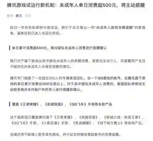 腾讯公司官方发布公告称,经过一年的多轮调研与测试后,于近日推出一项“未成年人游戏消费提醒”的新服务,覆盖《王者荣耀》、《英雄联盟》、《QQ飞车》手游等多款产品。目前,该服务已进入试运行阶段。