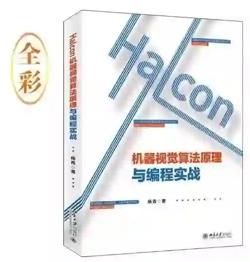 2019年11月,北京大学毕业的杨青老师新出版了一本书:《Halcon机器视觉算法原理与编程实战》,可谓是Halcon圣经:该书对机器视觉图像处理的各种技术做了原理上的分析和代码实现,包括从环境搭建到提取结果全流程讲解,且全彩印刷。这本书长这样: