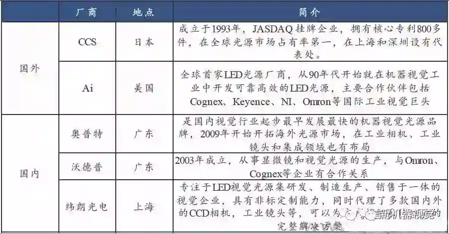 光源是国产化最充分环节。光源的好坏在于对比度、亮度和对位置变化的敏感程度,机器视觉行业主要采用LED 光源产品。目前没有通用的机器视觉照明设备,针对每个特定的应用实例有个性化的方案,以达到最佳效果 。目前光源行业国产化程度高,竞争比较激烈。