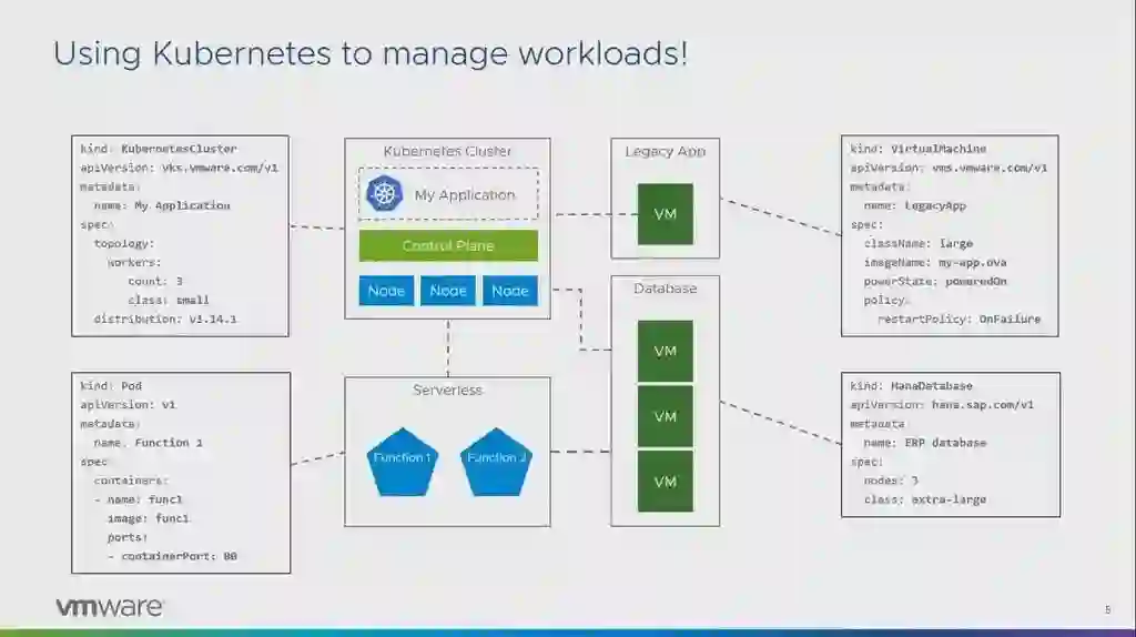Jared Rosoff是VMware最近宣布的Project Pacific的产品管理高级主管,他在本月初的VMworld 2019大会期间解释:“Kubernetes拥有自定义资源定义、控制器和operator等概念,这些概念让我们得以为Kubernetes添加新的对象类型。于是我们想,如果我们使用Kubernetes的这个方面来构建一种新的云平台,将会怎么样?如果我们使用同样这种预期状态模式来管理Kubernetes集群、虚拟机[VM]、Serverless应用程序和数据库,将会怎么样?”