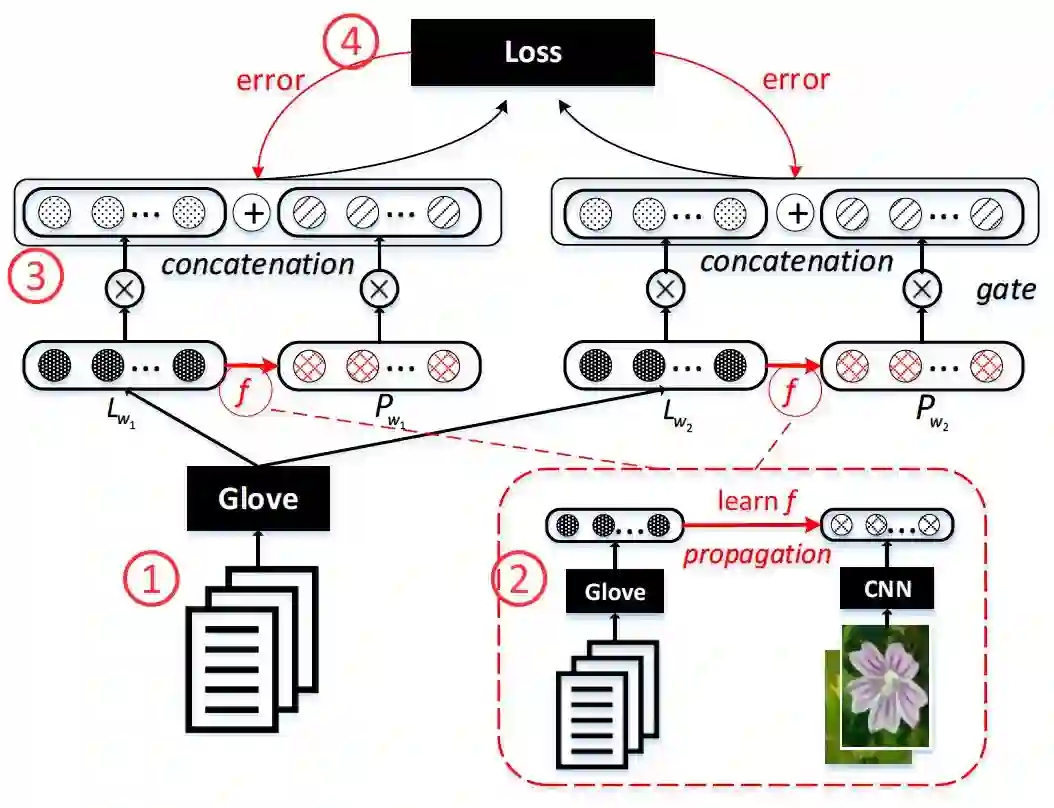 模型主要分4步, 分别对应: 1. 文本的Glove词向量学习,2. 文本信息和感知信息之间的映射的学习, 3. 基于文本和感知信息进行多模态融合, 各个模态的权重有Gate控制, 4. 优化模型. 其中, 是一对相关词pair, 是它们的词向量, 是它们的感知信息.