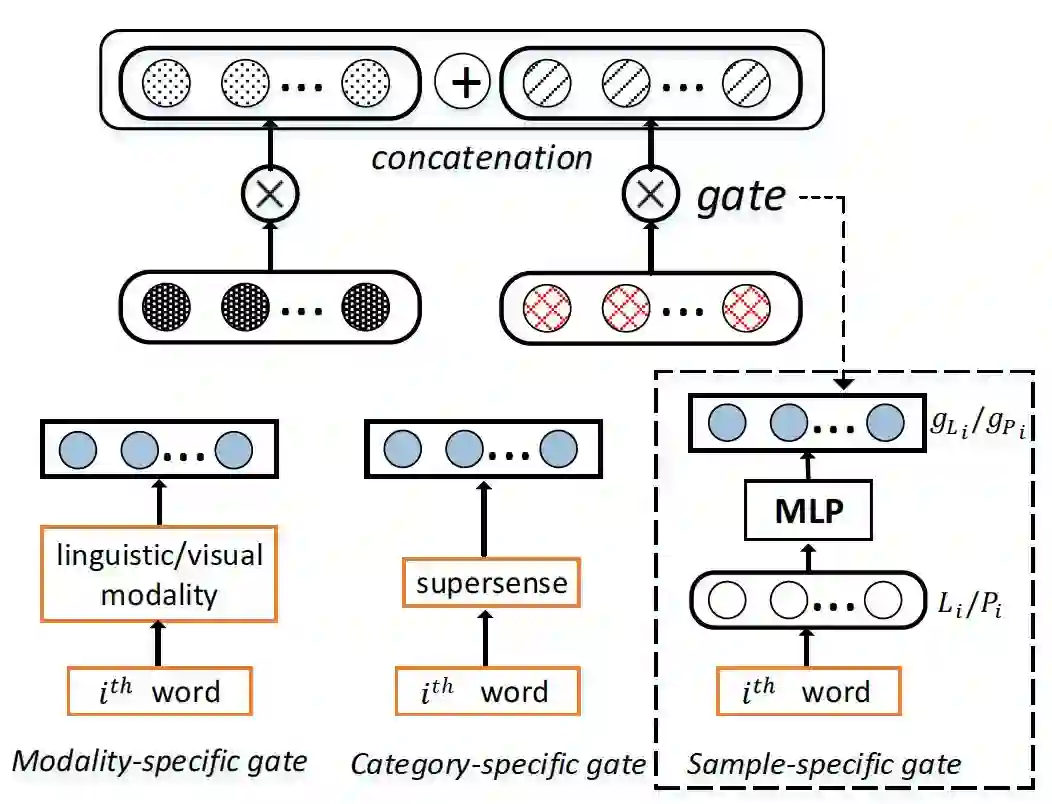 学习到好的基于多模态的词的语义表示, 不仅仅需要高质量的文本语料和感知信息, 还要很好的将这些信息组合起来. 然而, 当前的多模态模型, 通常同等的对待每个模态. 这显然是不符合实际情况的, 比如: 马, 计算机, 这一类有具体对象的词, 明显更偏向感知信息(视觉, 听觉, 触觉)一些, 而另一些抽象词, 比如爱, 希望, 之类得更偏心理学一些. 所有的这些因素都激励着本文构建出一个基于词的类型来动态融合多模态信息的模型.