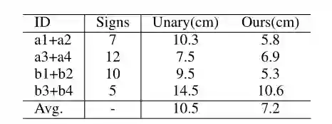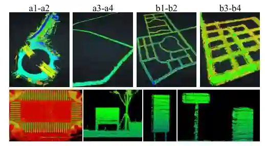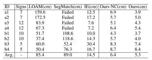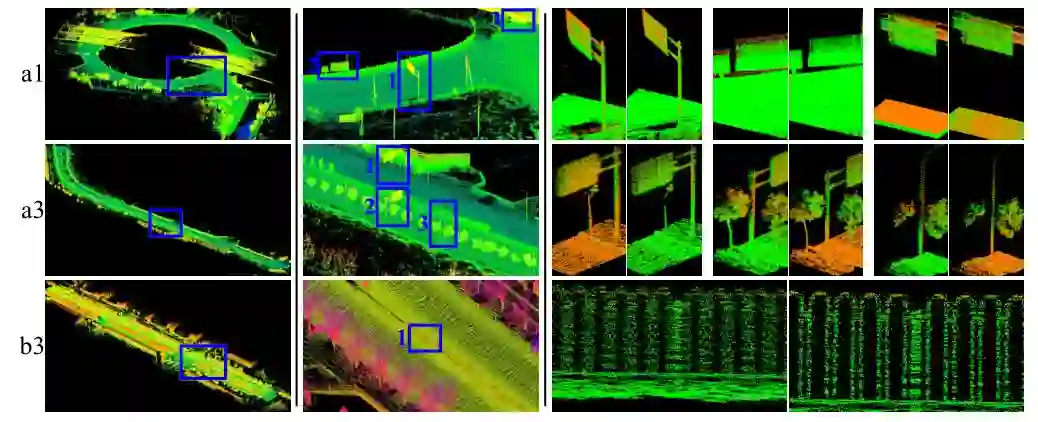 本文的扫描系统包括INS、差分GPS、velodyne HDL-32E,采用线下标定,车辆以40km/h 、60km/h的四度分别在城市道路、高速道路上行驶几个小时。人工放置和测量了多个有代表性的对象(道路标志和地标见下图 )包括常见的道路区域和弱GNSS信号区域,每一对有同样对象用于多事务间的评估。
