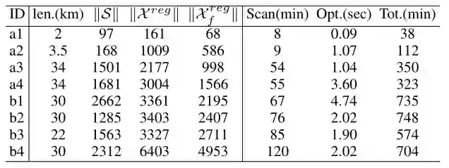 我们在下表中列出了总的长度和每一个事务的构造图的规模,还展示了scanning时间,图优化时间和总的运行时间。