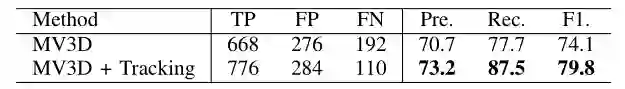 下表展示我们的基于MH-EKF的时空移除的策略的效率。所列出的结果清楚地展示了我们的方法的效率,追踪的策略明显地提高了回调。