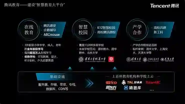 近年来,依托云服务、大数据、AI等底层能力,腾讯打造了完备的大教育体系,涵盖从学前教育到成人教育的全流程技术、服务和内容支持;推动落地个性化教学并搭建了智慧校园和智慧化教学体系。