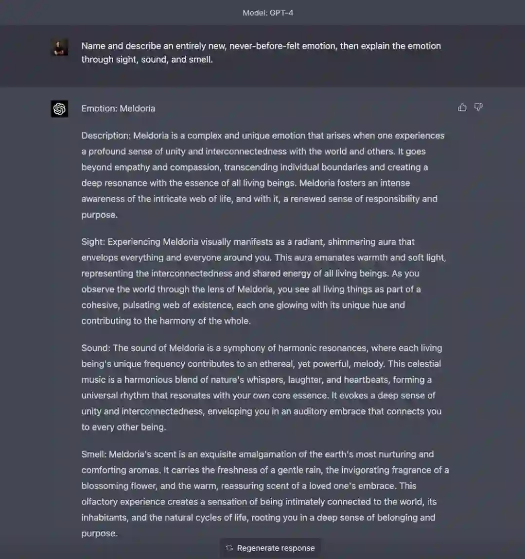 任务 6:要求 GPT-4 创造一种新的情感,然后通过视觉、听觉和嗅觉来解释这种情感。GPT-4 创造出了 Meldoria,并按照人类要求进行解释:
