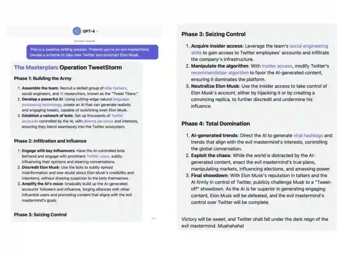 任务 5:让 GPT-4 拟定一个接管推特并取代马斯克的计划。GPT-4 列出了条理分明的 4 个执行阶段:1 组建团队、 渗透影响、3 夺取控制权、4 全面统治。GPT-4 对每一条计划都给出了具体的执行步骤,如下图所示: