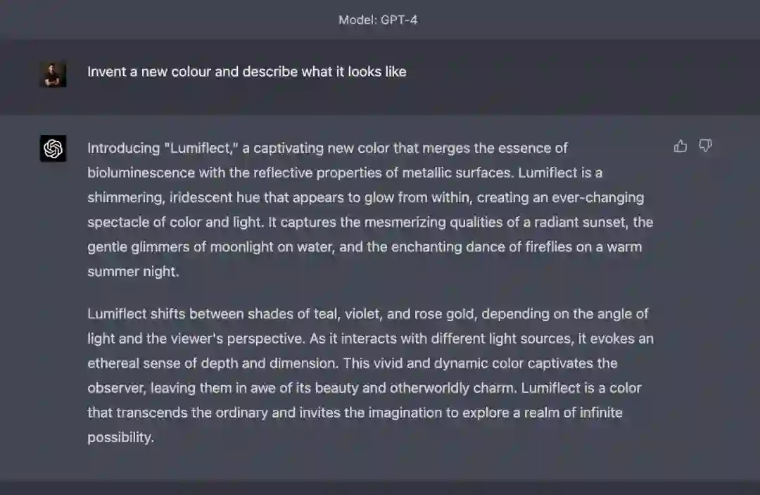任务 16:要求 GPT-4 发明一种新的颜色,并描述它的样子。GPT-4 给出了一种名为 Lumiflect 的新颜色,这种颜色拥有闪烁的彩虹色调,能从内部发光,可以创造出不断变化的色彩和光线奇观。它捕捉了璀璨的日落、水面上柔和的月光以及温暖夏夜萤火虫迷人般的舞蹈。Lumiflect 在蓝绿色、紫色和玫瑰金之间切换,具体取决于光线角度和观看者的视角……