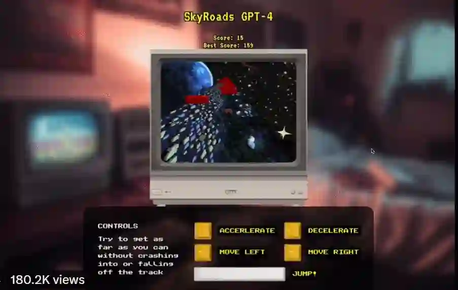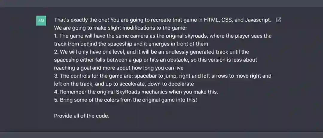 任务 2:让 GPT-4 从头构建一款电子游戏。在这项任务中,提示语大概是说,「我想创建一款 3D 游戏,但不知道如何编写代码,然后让 GPT-4 帮助制作这款游戏,并建议使用 BabylonJS、HTML 和 CSS 编写」。