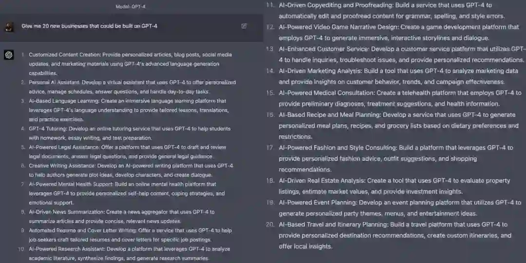 任务 8:基于 GPT-4 创造 20 种新业务,并说明这些工作可以做哪些事。GPT-4 给出的答案如下所示:例如基于 GPT-4 构建个人 Al 助理,其可以提供个性化建议、管理日程安排、回答问题和处理日常任务;又比如基于 GPT-4 开发辅导类产品,帮助学生完成家庭作业、论文写作、考试准备、在线辅导等。