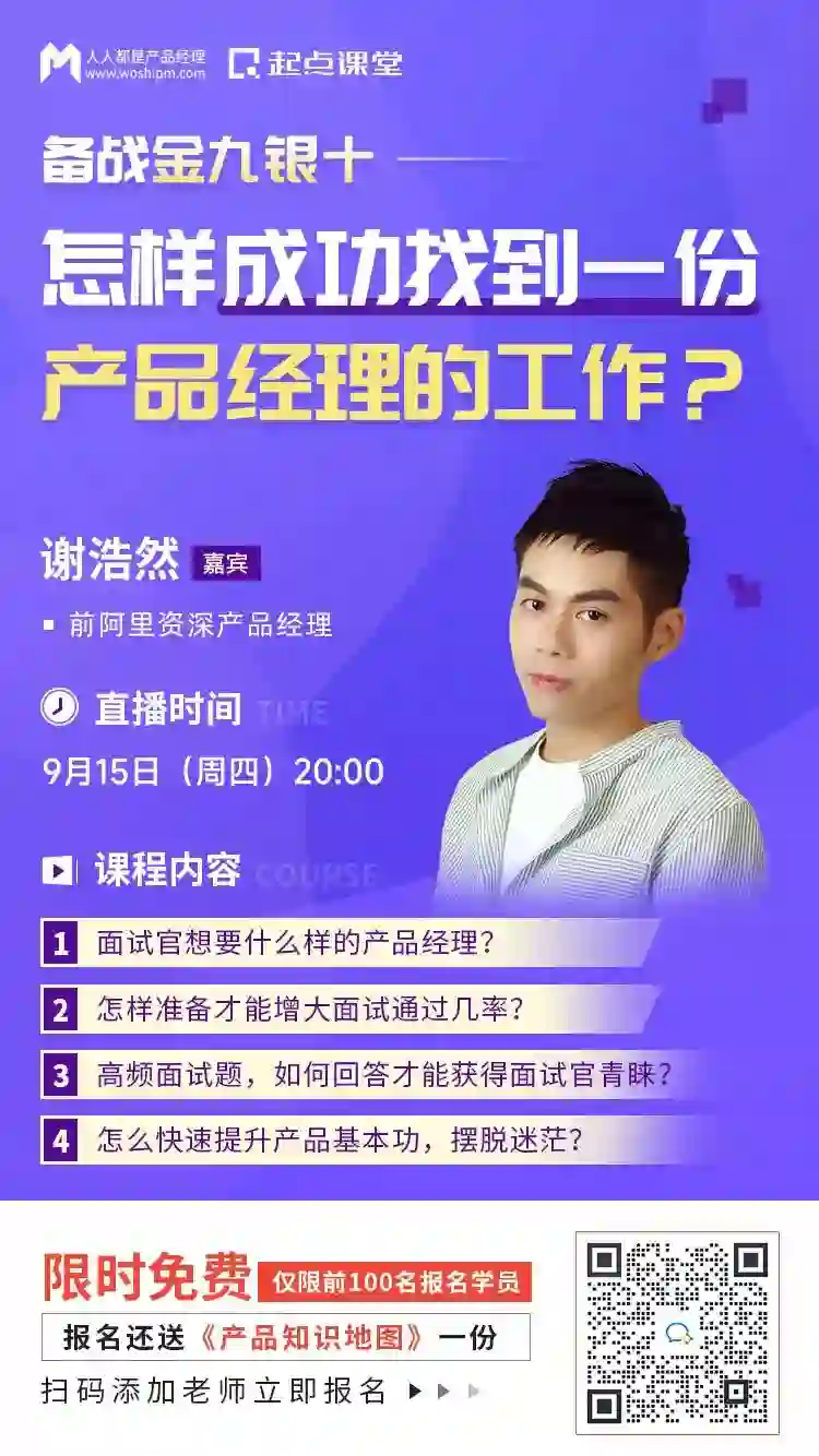 我们邀请了前阿里资深产品经理@谢浩然老师,1小时在线直播,给大家分享产品面试中的高频问题和破题思路,助你顺利拿到产品offer!