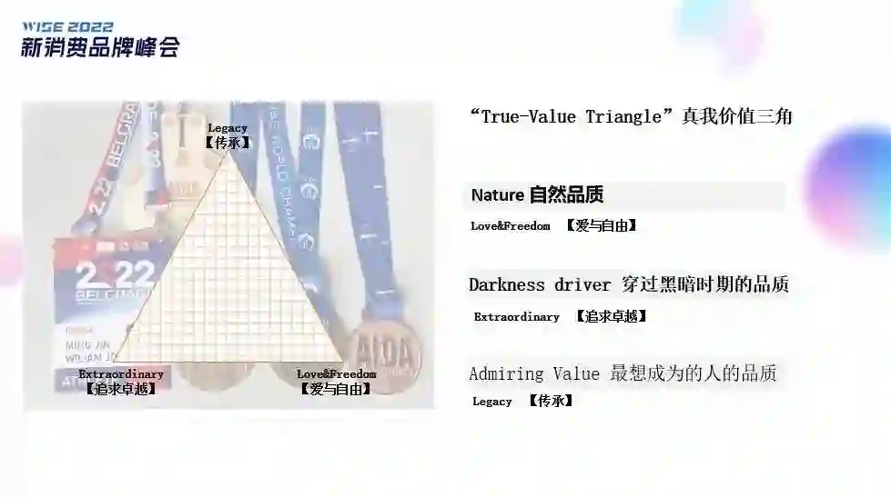 这是真我价值三角模型,非常复杂,可能需要很长时间自我内观探索,我用了两年时间,把这个模型做了简化。它的三角中,一个是“自然品质”,对我来说我找到我的自然品质是“爱与自由”;第二个角是“伴随你度过黑暗时期的最单一的品质”是什么?对我来说是“追求卓越”;最后一个角是“你最想成为人的品质”,对我来说是“传承”。