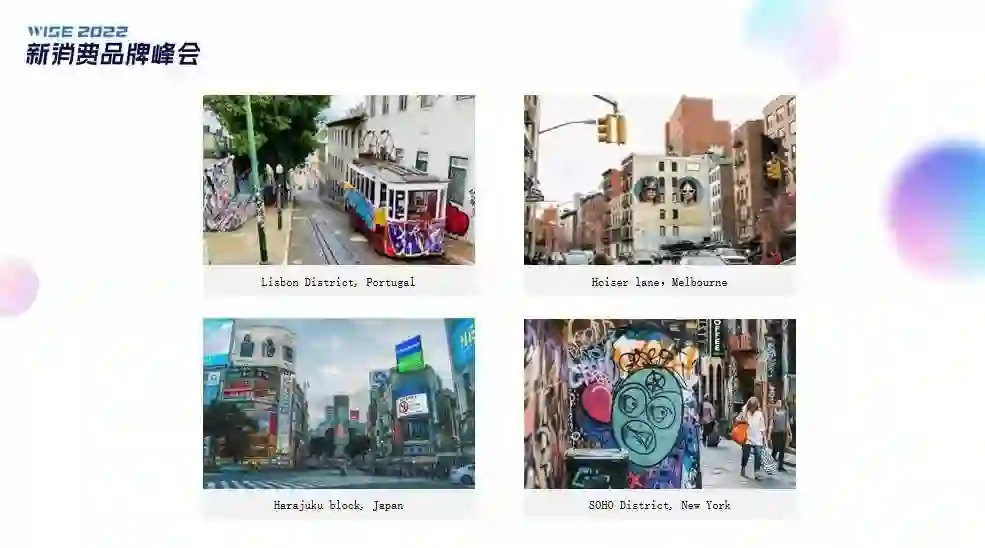 前阵子刚刚从欧洲比赛回来,大家知道这两年我多了国家运动员的身份,而今天很想跟大家分享近期关于文娱这块的思考。这是很多人去国外,会看到的街头景观,比如像里斯本涂鸦区,东京的原宿,纽约的SOHO。