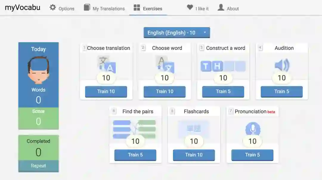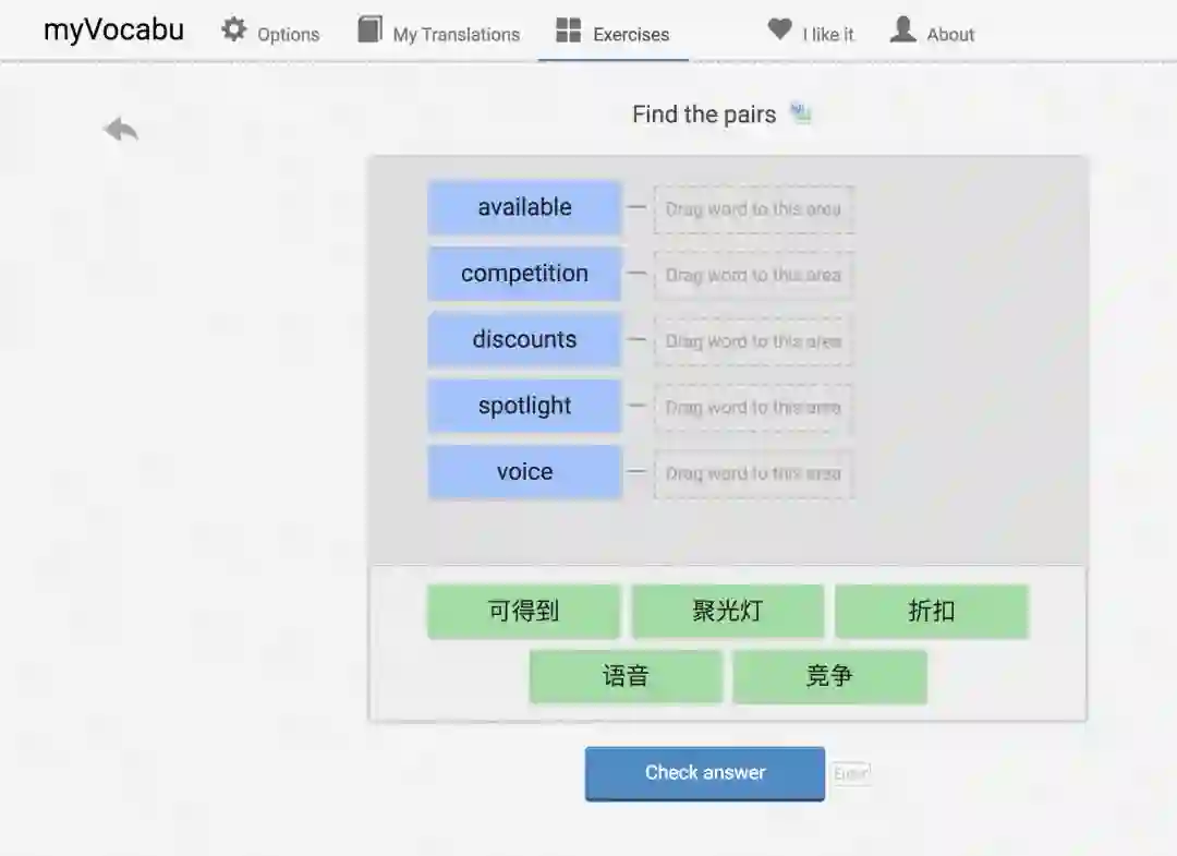 在 Exercises 中,myVocabu 还提供了数种小测验,以游戏的形式让你掌握词汇。