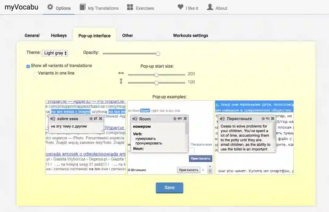 在 myVocabu 的设置中,你可以选择查词的方式,有双击、选中、快捷键、鼠标悬停等;还预制了数款主题样式,你可以依喜好随意搭配。