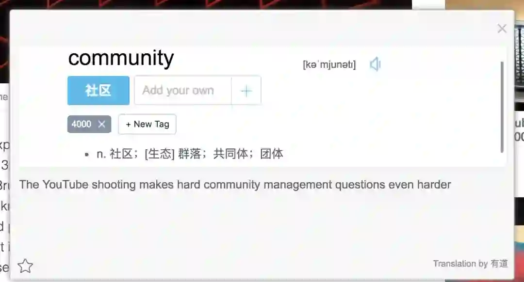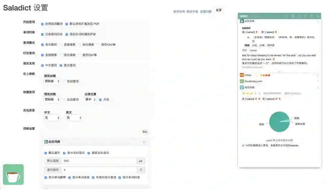 Chrome 上各类划词翻译的扩展可谓数不胜数,而令 Saladict 与众不同的,是其内置了多个查词引擎。只要选中网页内单词后点击右上角的沙拉图标,Saladict 就会为你检索必应词典、海词词典、Urban Dictionary 和 Vocabulary.com 这 4 家的权威释义,助你全方位掌握外文词汇。
