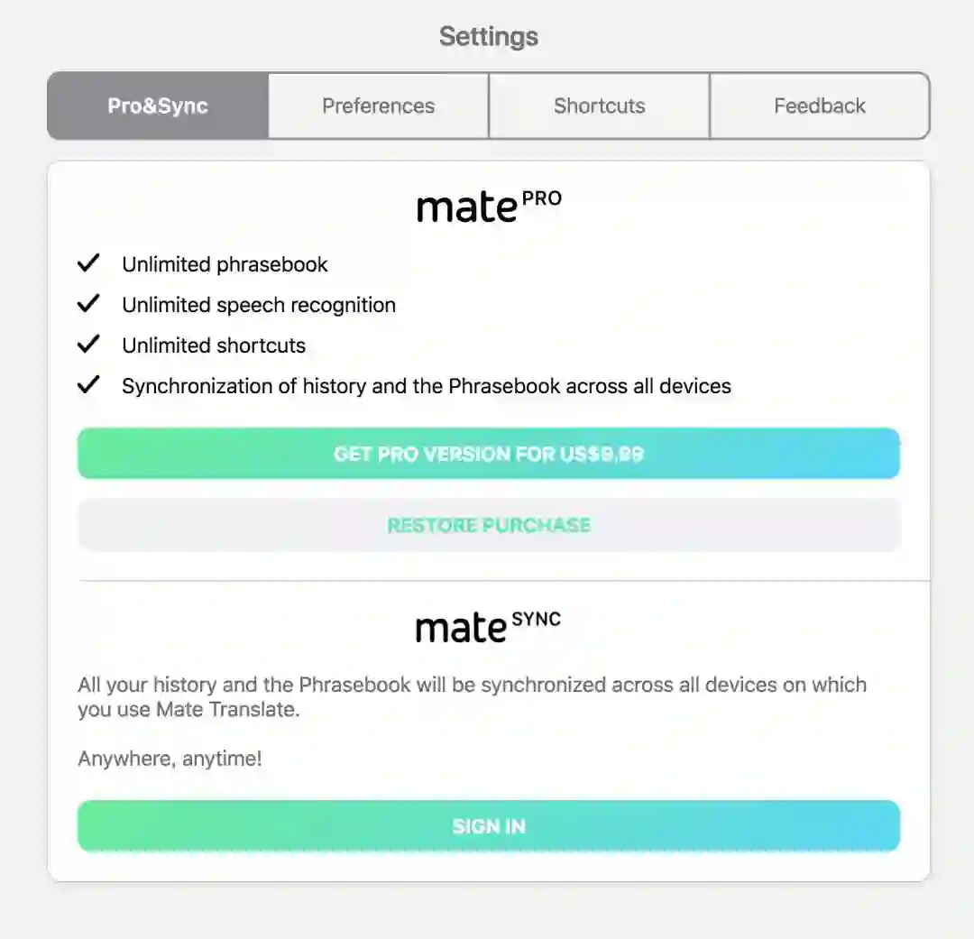 Mate Translate 的绝大部分基础功能免费,云端同步、无限词库等功能需要花费 9.99 美元解锁。如果你已经订阅了 Setapp,则可以免费使用专业版功能。