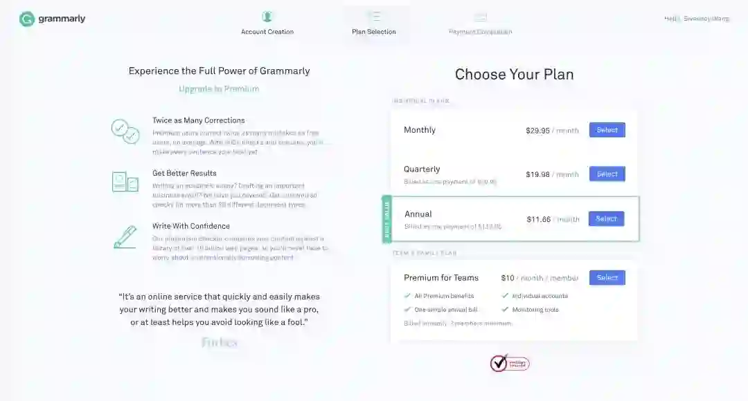Grammarly 基础功能免费,订阅高级版后,你还能获知更多语法信息,并得到更专业的纠错建议。不过最低每年 140 美元的订阅费用,我想应该超出了大部分人的心理预期吧。