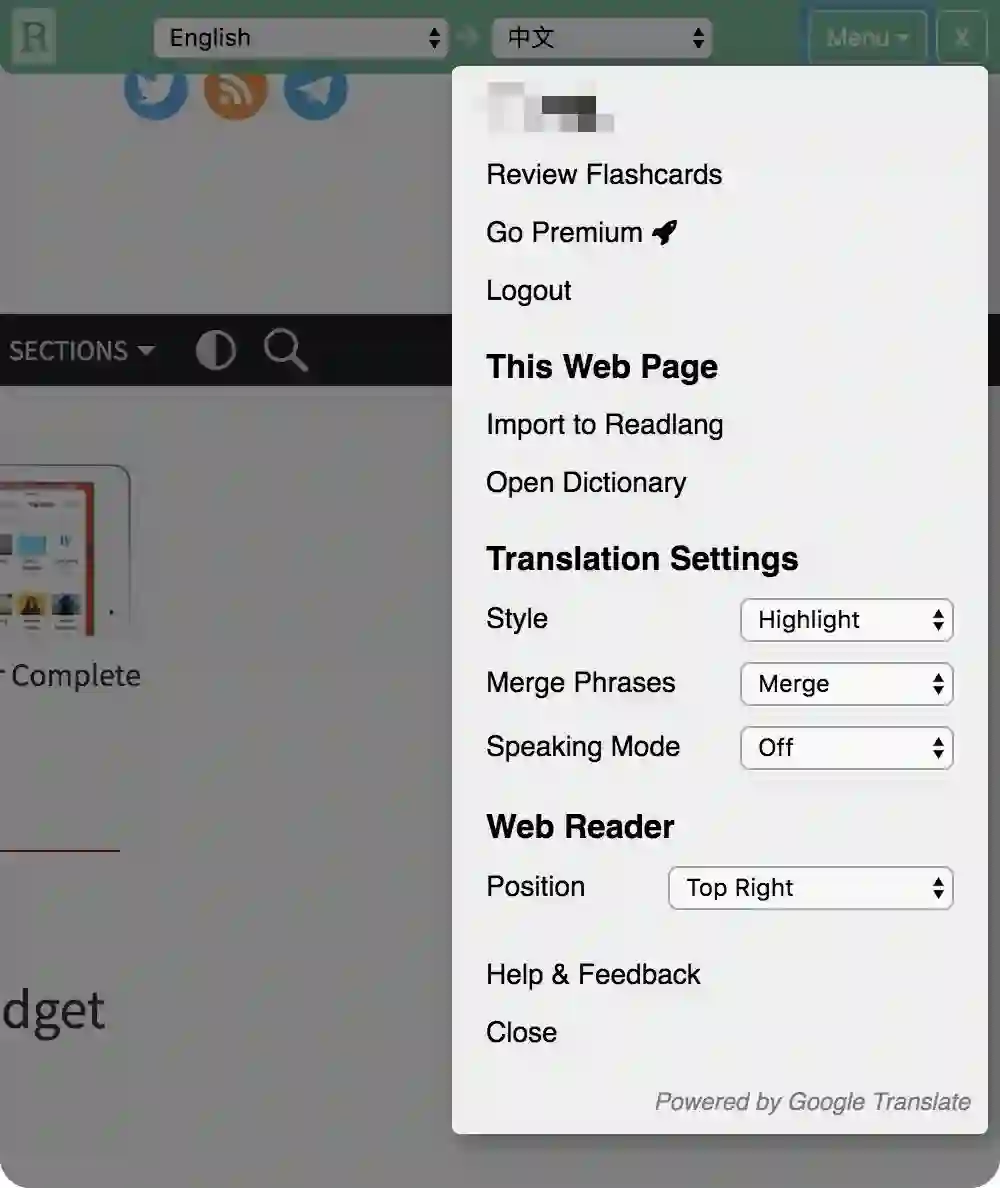 在 Readlang Web Reader 的设置中,你可以选择翻译对象、标注样式等。用 Google 账户登录后,你还可以解锁整句翻译、生词卡等高级功能。