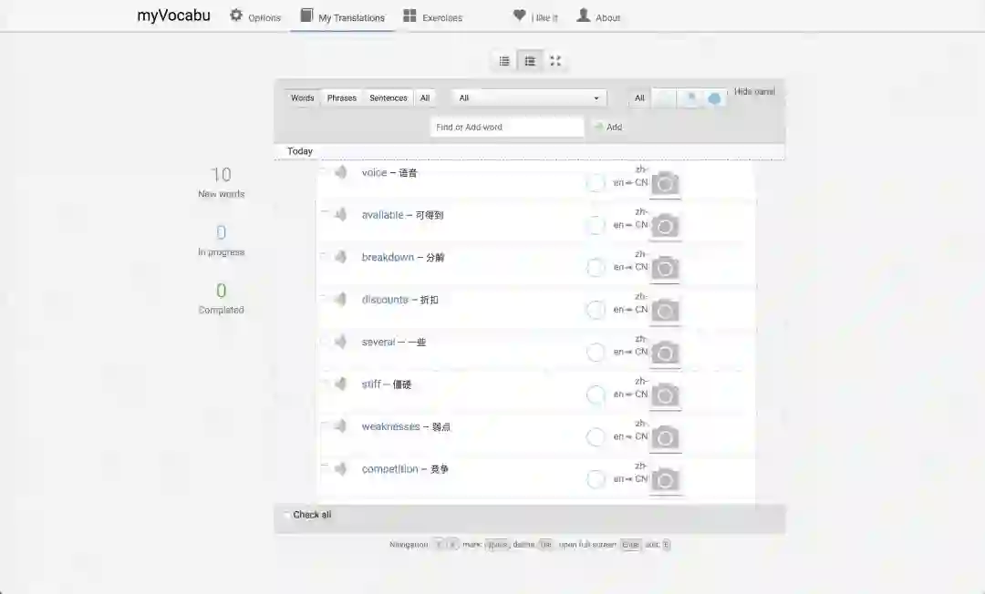 使用扩展一段时间后,你就可以在 My Translations 里集中查阅自己的查词历史,并逐个查看释义、图解,完全掌握后,就可以标记为 Completed 了。