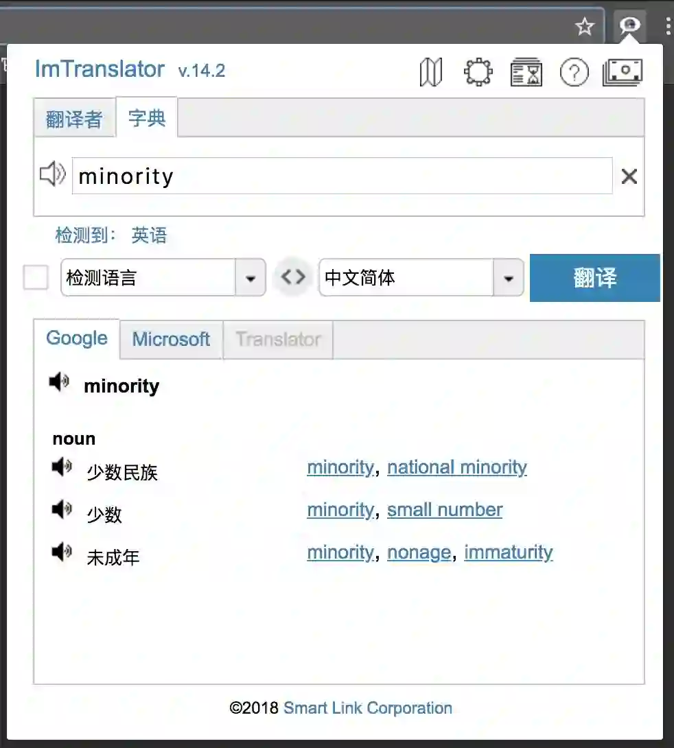 ImTranslator 是一款功能相当全面的多语言翻译扩展,安装后,只需要点击浏览器工具栏上的扩展图标,你就可以调用 Google、Microsoft 等引擎翻译所输入的整句或使用字典查询单词。点击右侧的小喇叭图标,你还可以聆听词句的标准发音。